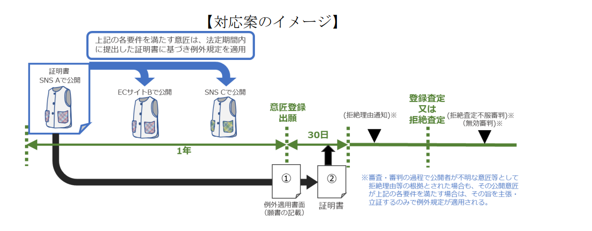 現行の意匠法では、意匠登録出願前1年以内に、意匠登録を受ける権利を有する者の行為に起因して公知となった意匠等について、所定の手続を行うことにより、新規性等が喪失しなかったものとみなすこととされている(意匠法4条2項)。本規定の適用を受けるためには、①出願と同時に、その旨を記載した書面を提出、あるいは願書にその旨を記載し、②出願から30日以内に、当該規定の適用を受けることができることを証明する書面(以下「例外適用証明書」という。)を特許庁長官に提出しなければならない(同条3項)。