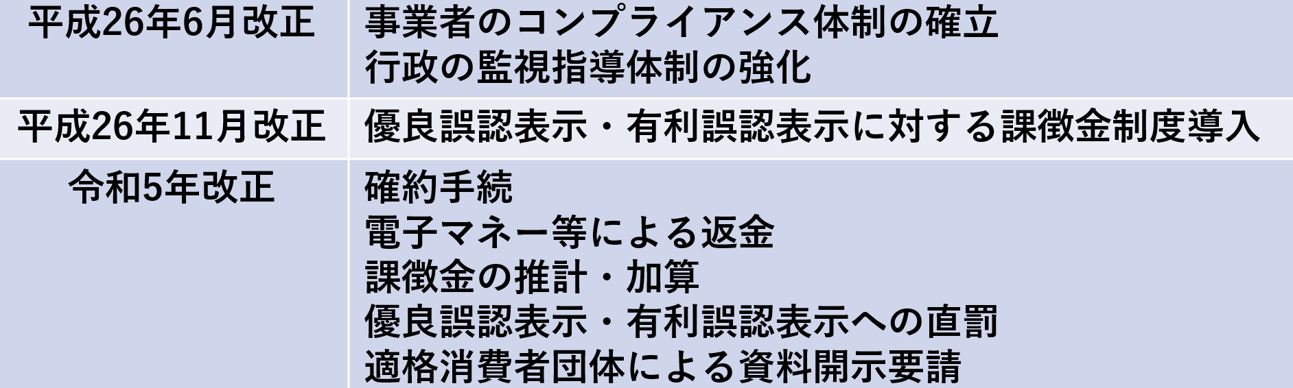景表法は近時では平成26年6月及び11月に改正されており、平成26年6月改正法は事業者のコンプライアンス体制の確立(事業者が講ずべき表示等の管理上の措置に関する規定)、行政の監視指導体制の強化等を内容とするものであり、同年12月に施行された。また、平成26年11月改正法は優良誤認表示及び有利誤認表示に対する課徴金制度を導入するものであり、平成28年4月に施行された。