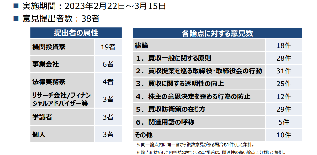 経済産業省は、2023年3月28日、「公正な買収の在り方に関する研究会」(座長:神田秀樹学習院大学大学院法務研究科教授)(以下「本研究会」という。)第6回の会合を開催した。同会合においては、2023年2月22日から同年3月15日まで実施されたパブリックコンサルテーション[1]による主要な論点に関する意見・情報の提供の募集結果が報告されるとともに、同会合における議論用の原案として指針原案(以下「本指針原案」という。)が提示された[2]。