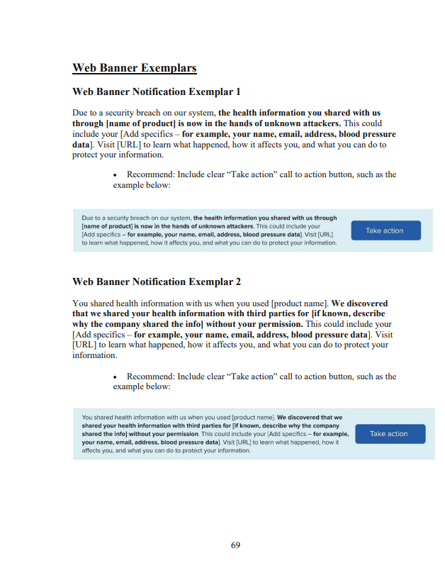 健康侵害通知規則は、対象となるの事業者が、個人を識別可能なPHRの侵害が発生した60日内(500人以上の個人が影響を受ける場合は10営業日以内)に、関係する個人とFTCに通知することを義務付けている。健康侵害通知規則の違反行為は連邦取引委員会法5条の「不公正若しくは欺瞞的な行為又は慣行」(unfair or deceptive act or practice)とみなされ、制裁金の対象となる。