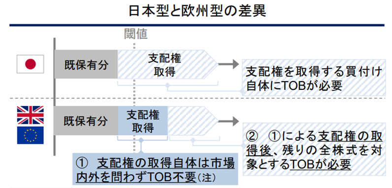 現行法上の義務的公開買付けは、一定の閾値を超えた株式の取得に際して公開買付けの実施を強制するものであり、事前規制である。一方、欧州においては支配権の取得自体には公開買付けの実施は強制されておらず、支配権取得後に、全株式を対象とする公開買付けの実施を義務付ける形で事後的な規制がなされている(株主から見た場合には共同売却請求権、買付者から見た場合には全部買付けを実施する義務)。