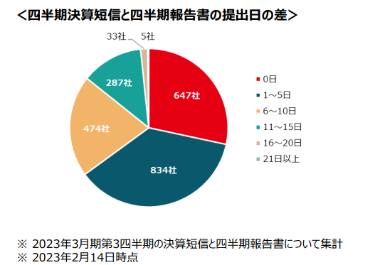 図1 内容面の重複に加え、提出企業2280社のうち、約65%に当たる1481社の提出日の差が5日以内であり、開示のタイミングが近接していることも一本化を進める理由の一つとなった(東京証券取引所「四半期開示の見直しに関する実務検討会第1回事務局説明資料」13頁)。