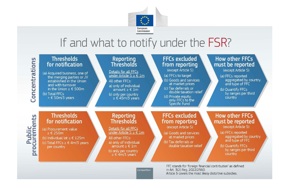 FSRは2021年5月に欧州委員会により提案され、2022年6月に欧州議会と欧州理事会で記録的な速さで合意された。FSRは、2023年1月12日に発効し、2023年7月12日から適用されたが、事前届出義務は、2023年10月12日以降に適用されることになる。