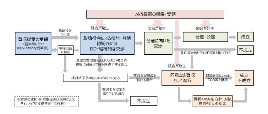 上場会社の経営支配権取得の買収は、通常は公開買付けへの応募により株主意思が表明され、その前提として株主の適切な判断のために必要な情報(買収者による公開買付届出書等への適切な記載、対象会社による意見表明等)や時間を確保するための制度的枠組みが構築されている。他方、公開買付けによらない市場内買付け等、制度的枠組みで十分対応できない例外的かつ限定的な場合に、同意なき買収に対する対応方針・対抗措置[5]が用いられることがあり、この場合には、買収への対応方針・対抗措置への賛否を巡り、株主総会における株主意思の確認が基本となる。