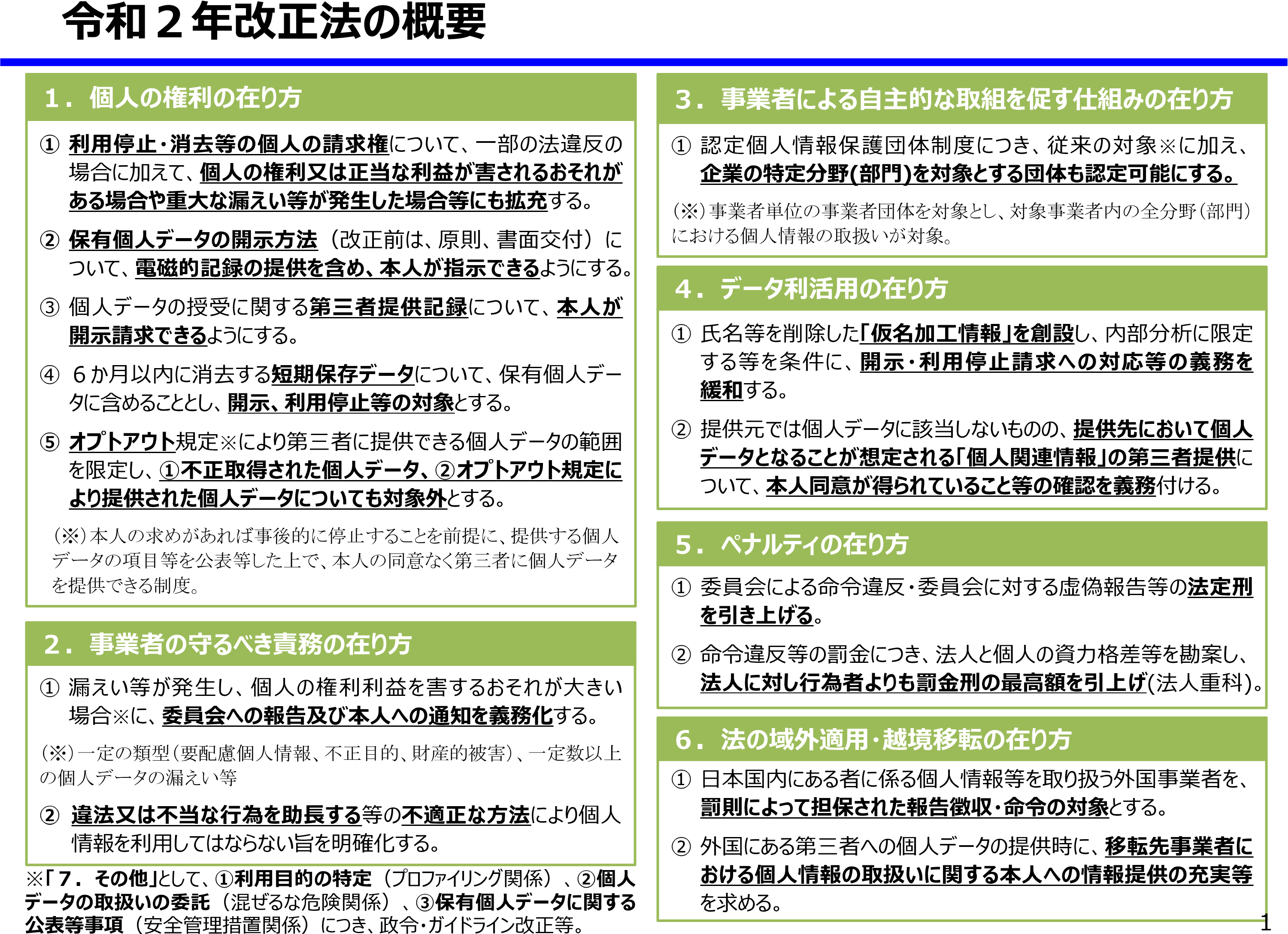 令和2年個情法改正における主要な変更点としては、漏えい等が発生し、個人の権利利益を害するおそれが大きい場合の個人情報保護委員会への報告等が義務化されたこと(個情法26条)、個人情報の不適正利用の禁止が明確化されたこと(同法19条)、「仮名加工情報」という新たな情報の枠組みが導入されたこと(同法第4章第3節)、越境移転に関する規制の強化(同法28条)等が挙げられる。より詳細な改正法の概要は、以下の図表に記載のとおりである。