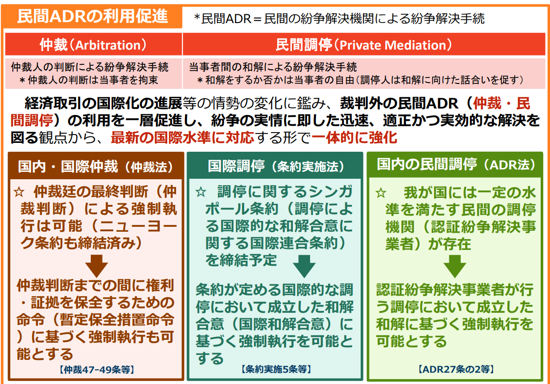 出典:「仲裁法の一部を改正する法律、調停による国際的な和解合意に関する国際連合条約の実施に関する法律、裁判外紛争解決手続の利用の促進に関する法律の一部を改正する法律」(法務省[4])