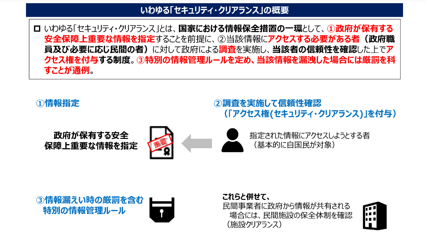 セキュリティ・クリアランス制度とは、政府が保有する安全保障上重要な情報として指定された情報(CI(Classified Information))にアクセスする必要がある者(政府職員及び必要に応じ民間事業者の従業者等)に対して、政府による調査を実施し、当該者の信頼性を確認した上でアクセスを認める制度をいう[1]。