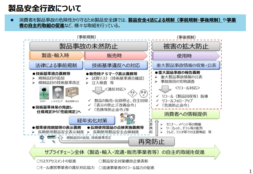 消費者を製品事故から守るための規制として、消費生活用製品安全法(以下「消安法」という。)をはじめとするいわゆる「製品安全4法」[1]による事前規制(技術適合義務や販売時のPSマーク)、事後規制(重大製品事故が生じた場合の報告)や、事業者自身による自主規制の取り組みなどが存在する。