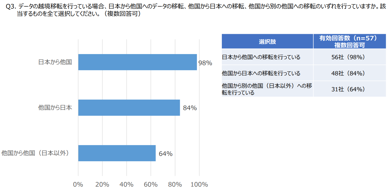 個人データの越境移転(外国にある第三者への提供に加え、外国において個人データを取り扱う場合を含む。以下同じ。)を行っているかの質問に対しては、回答企業66社のうち、57社(86%)が行っていると回答した(本報告書15頁)。また、その移転元および移転先は、日本から他国への移転が56社(98%)、他国から日本への移転が48社(84%)、他国から他国への移転が31社(64%)であると回答した(本報告書16頁)。かかる調査結果からは、多くの企業において、個人データを国境を越えて取り扱っている実態が窺われる。