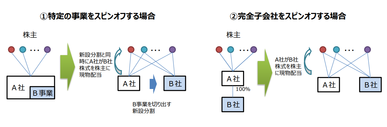 そもそもスピンオフとは、自社の特定事業を切り出して設立した新設子会社又は自社の既存子会社の株式を、自社の株主に交付することにより、当該事業又は子会社を自社から切り離して独立させる組織再編取引である。