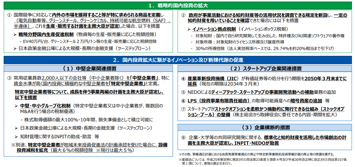 「国内投資拡大に繋がるイノベーション及び新陳代謝の促進に向けた措置」としては、①常用従業員数2,000人以下の会社等を「中堅企業者」、特に賃金水準が高く国内投資に積極的な中堅企業者を「特定中堅企業者」として定義したうえで、M&Aを行う際の税制優遇や金融支援、設備投資減税を整備し、②スタートアップ企業関連措置として、JICの有価証券等処分期限の延長、NEDOによるディープテック・スタートアップの事業開発活動への補助業務の追加、LPSの暗号資産保有の追加、ストックオプション・プールの整備が定められ、③企業横断的措置として、企業・大学等の共同研究開発に対する計画認定・助言が整備される。