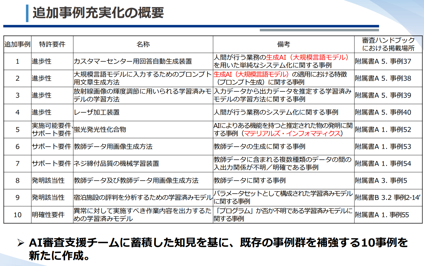 特許庁審査第一部調整課審査基準室は、令和6年3月13日付でAI技術に関する特許審査事例を10件追加し、公表した(以下「本件追加・公表」という。また、10件の事例をまとめて「本件追加事例」という。)[1]。以下では、本件追加・公表に至った経緯および本件追加事例の内容について概説する。