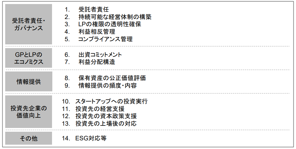 VCに関しては、タスクフォース報告書において、「GPの利益相反管理を含むガバナンス、GPがLP(リミテッド・パートナー。ファンドへの投資者)に提供する情報等に関する課題が挙げられる。」、「VCの投資のエグジットがスタートアップ企業の上場(IPO)に偏っており、いわゆる小粒上場の要因になっているとの指摘や、上場後にVCの経営サポート等がなくなることによりスタートアップ企業の持続的成長に向けた支援が途絶えてしまうことも課題」とされており、これらの課題の解決に向けたVC向けのプリンシプルとなることが想定される。