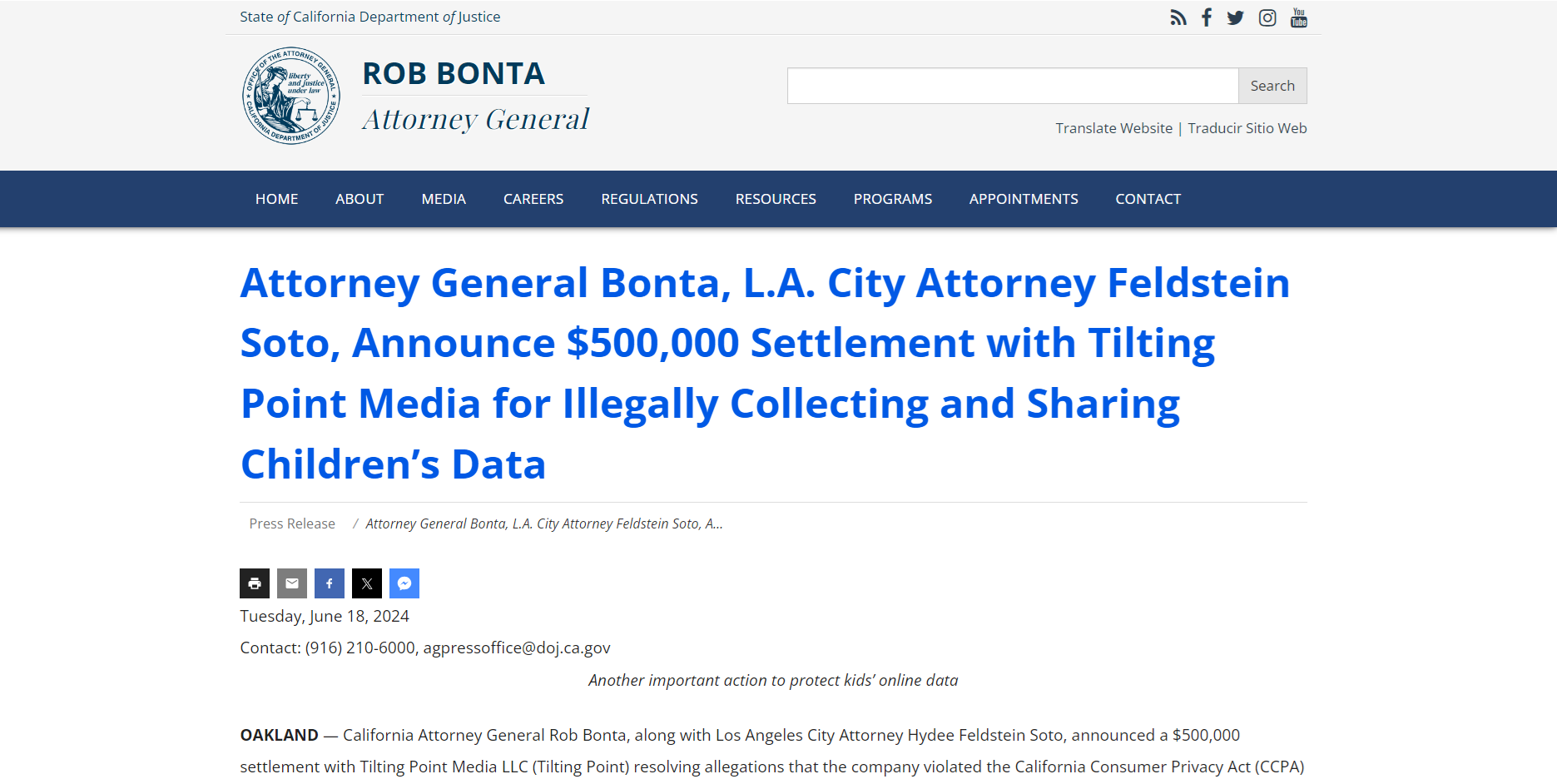 カリフォルニア州司法長官とロサンゼルス市検事、COPPA、CCPAに違反してこどものデータを収集・共有したTilting Pointとの50万ドルの和解を発表