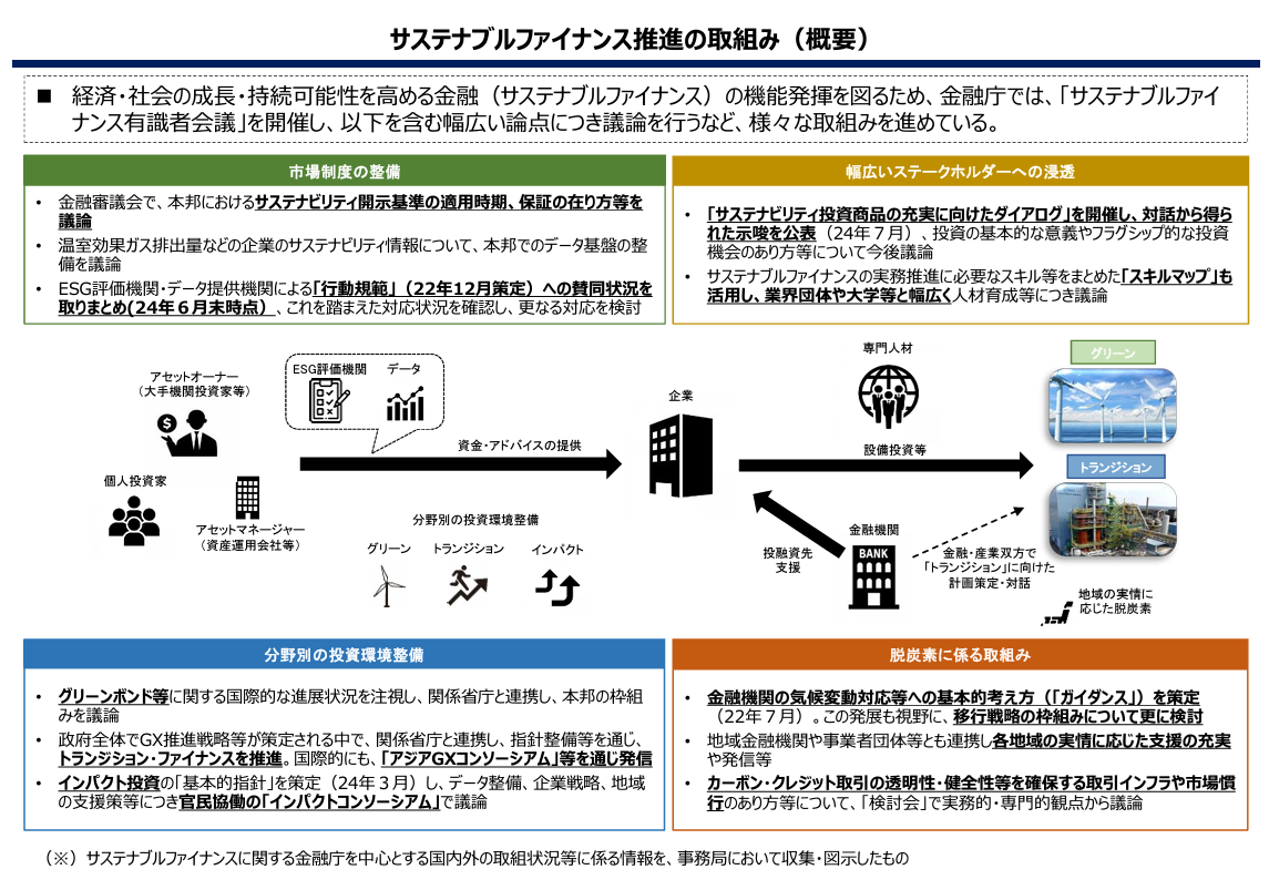 2024年7月9日、金融庁サステナブルファイナンス有識者会議(以下「有識者会議」という。)の第四次報告書が公表された。以下では、有識者会議およびその第四次報告書(以下「本報告書」という。)の内容につき概説する。