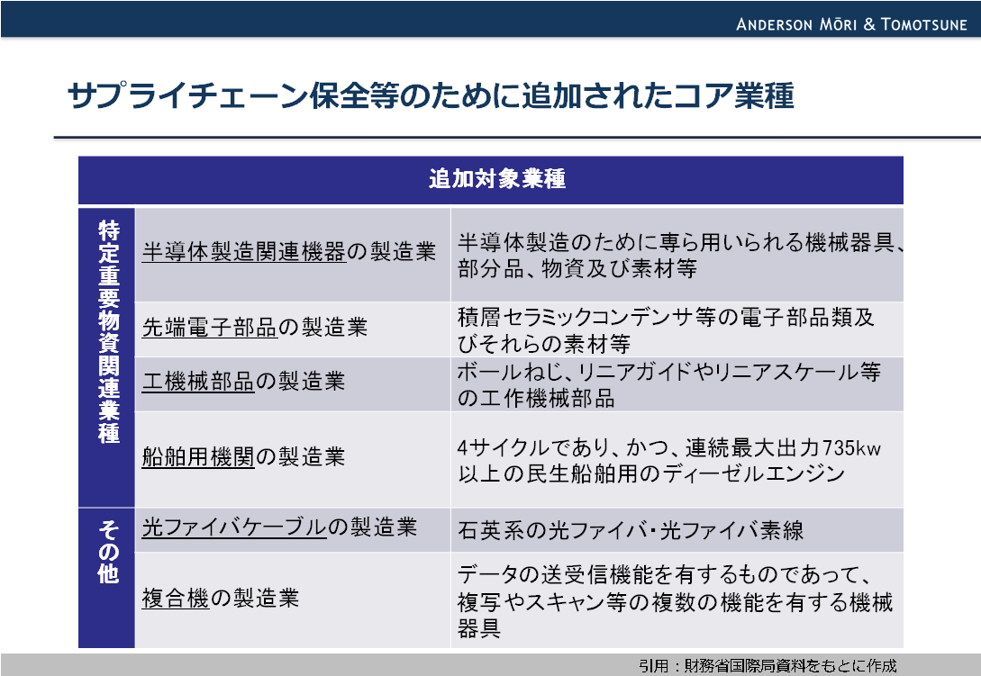 対内直接投資関連:サプライチェーン保全等のためのコア業種の追加に関する外為法関連告示の改正と外国籍パートナーシップの解釈の明確化