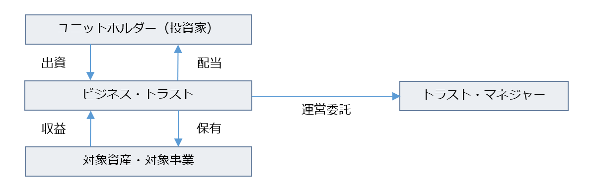 ビジネス・トラストは、ユニット・トラスト(Unit Trust)と呼ばれる信託型の事業体の一種であり、BTAに基づいて登録する制度が定められており、ユニット(unit)と呼ばれる投資持分を投資家に販売し、資金調達を行うことができる。ビジネス・トラストの事業の運営はトラスト・マネジャー(Trust Manager)と呼ばれる運用会社に委託されて運営される。ビジネス・トラストの典型的なストラクチャーは次の図のようなものである。