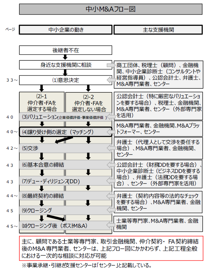 「中小M&Aガイドライン」は、後継者不在の中小企業を対象とする中小M&Aの当事者となる中小企業や、中小M&Aをサポートする各種支援機関の手引き・行動指針を示すことを目的として、2020年3月に中小企業庁が策定したガイドラインである。第1章(後継者不在の中小企業向けの手引き)と第2章(支援機関向けの基本事項)から構成され、下記の中小M&Aフロー図の各工程の説明や支援機関の行動方針等が記載されている。