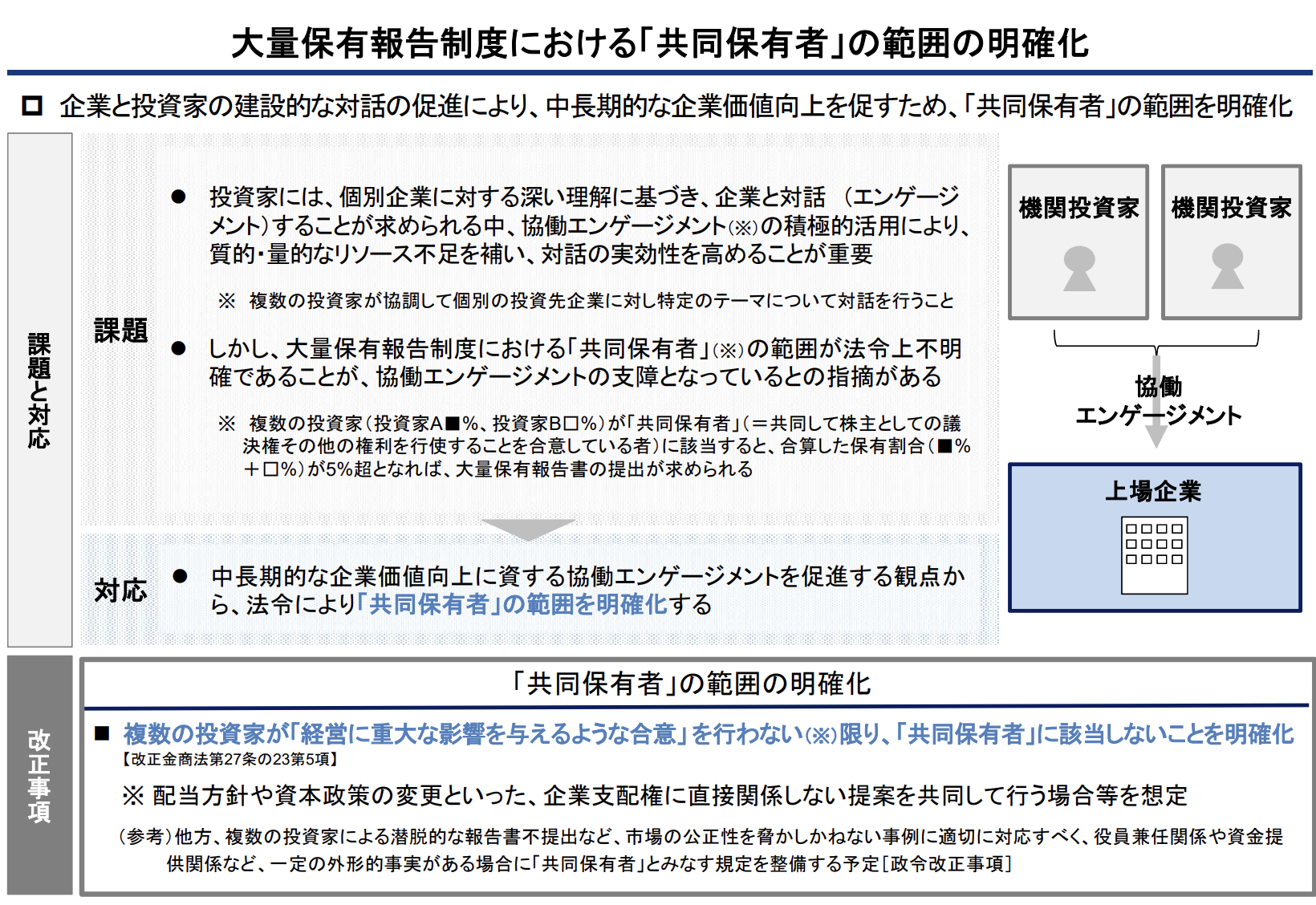 なお、大量保有報告制度における「共同保有者」の範囲の改正等を伴う、「金融商品取引法及び投資信託及び投資法人に関する法律の一部を改正する法律が、2024年5月15日に成立した。
