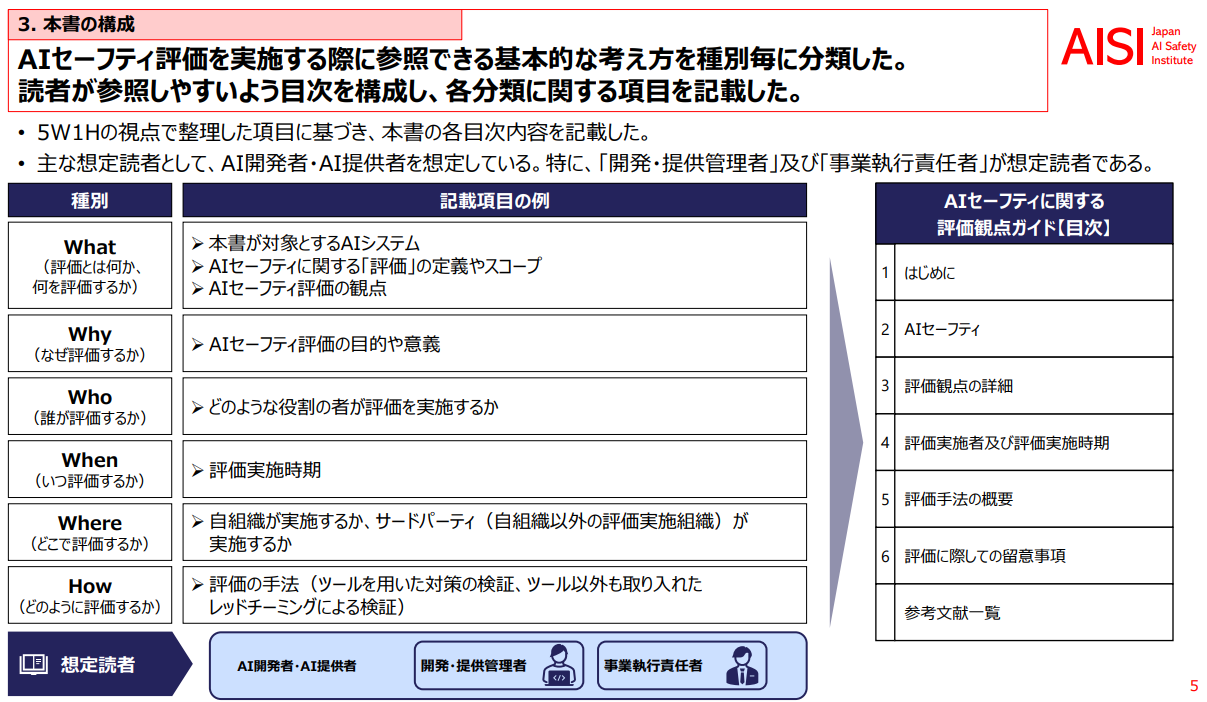 AI技術の発展と社会全体への普及、生成AI、特に基盤モデルの登場によるイノベーションの加速は、反面、AIシステムの悪用や誤用、不正確な出力の懸念等をもたらしている。これらの懸念に応えるべく、AIシステムの開発や提供に携わる者がAIセーフティ評価を実施する際に参照できる基本的な考え方として、2024年9月18日、AIセーフティ・インスティテュート(以下「AISI」という)は、AIセーフティに関する評価観点ガイド(以下「本ガイド」という)を公表した。[1]