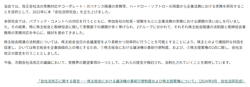 経営法友会、「会社法改正に関する提言――株主総会における議決権の事前行使制度および株主提案権について」(2024年9月 会社法研究会)(9月30日)