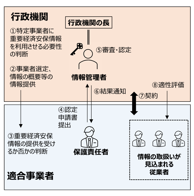 情報保全に係る内部規程については、保護責任者および業務管理者の指名、教育、施設設備、取り扱う従業者の範囲等14項目に関して定めることが求められており[25]、適合事業者の認定の審査においては、同規程の整備状況と同規程に基づく措置により申請者が重要経済安保情報を適切に保護することができると認められるかどうかが審査される(⑤)。審査の結果、適合事業者の認定を受けた場合には事業者に通知がされ(⑥)、適合事業者は行政機関と重要経済安保情報の提供を受けるための契約を締結することとなる(⑦)[26]。