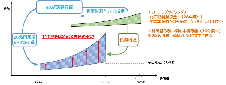そこで、GX実行会議は、国内投資を後押しし、すでに始動しているGXの取組を2040年に向けて飛躍させることを目的として、2023年7月に策定された「脱炭素成長型経済構造移行推進戦略」を改訂し、新たに本ビジョンを策定し、公表する予定である。