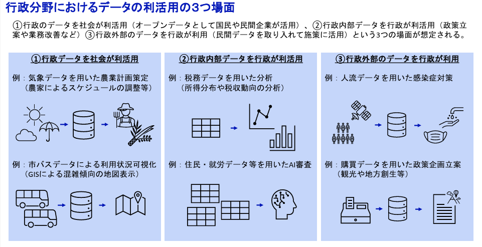 本稿では、第8回の本検討会で事務局から提出された「官民におけるデータ利活用」[2](以下「事務局資料」という。)およびデジタル庁から提出された「デジタル庁説明資料」[3](以下「デジタル庁資料」という。)の概要を紹介する形で論点を概観する。
