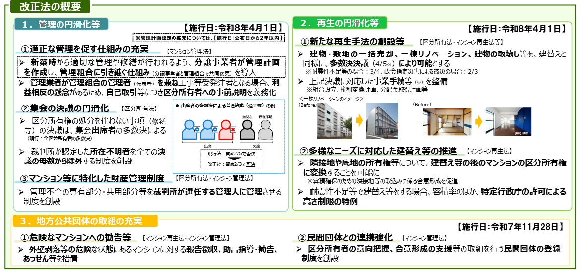 マンションは国民の1割以上が居住しているとされているが、マンションについては建物の高経年化と居住者の高齢化という「2つの老い」が進行しており、外壁剝落等の危険や集会決議の困難化など様々な課題が顕在化しつつある。こうした状況に対応するため、2025年5月30日に公布された「老朽化マンション等の管理及び再生の円滑化等を図るための建物の区分所有等に関する法律の一部を改正する法律(令和7年法律第47号)」(以下「改正法」という。)により「建物の区分所有等に関する法律」(以下「改正区分所有法」という。)を含む複数の法律が改正され、その中核となる改正区分所有法は2026年4月1日から施行されることとなっている。